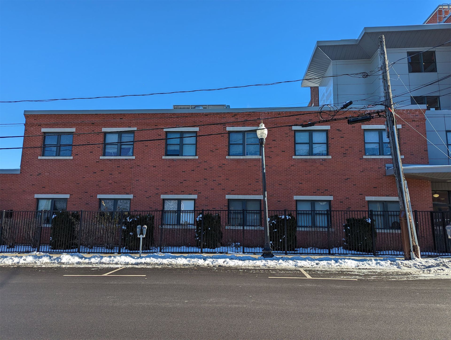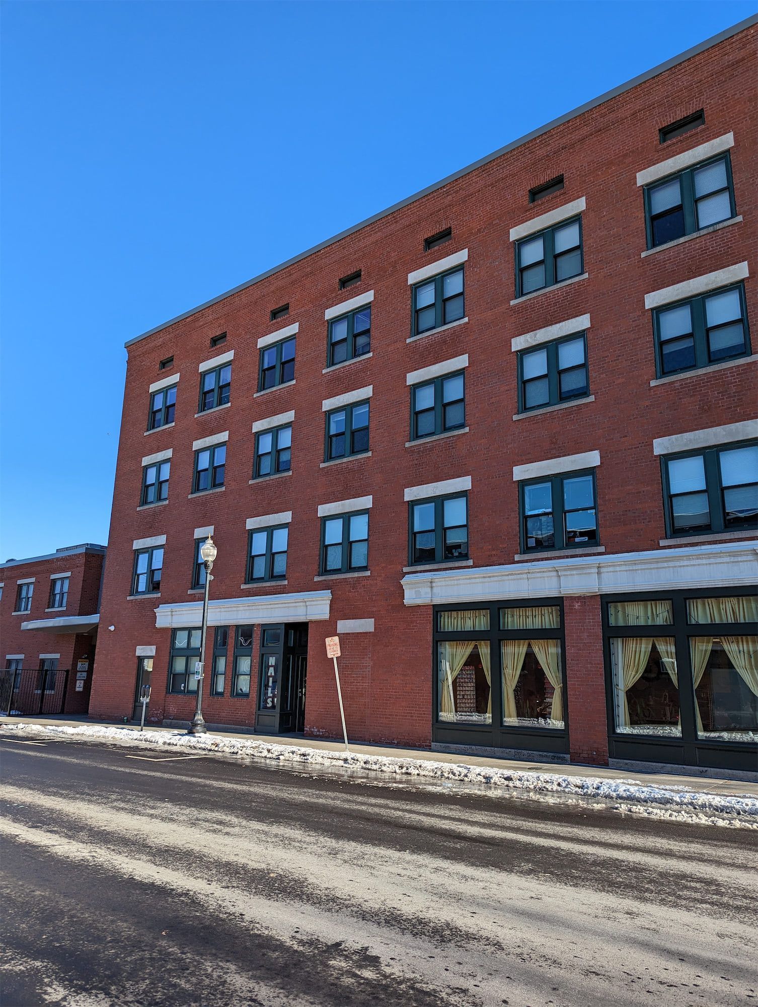 The Winslow Building in Greenfield, MA is a four story historic masonry building with a two story addition that includes 55 units of affordable housing and two ground floor commercial spaces.