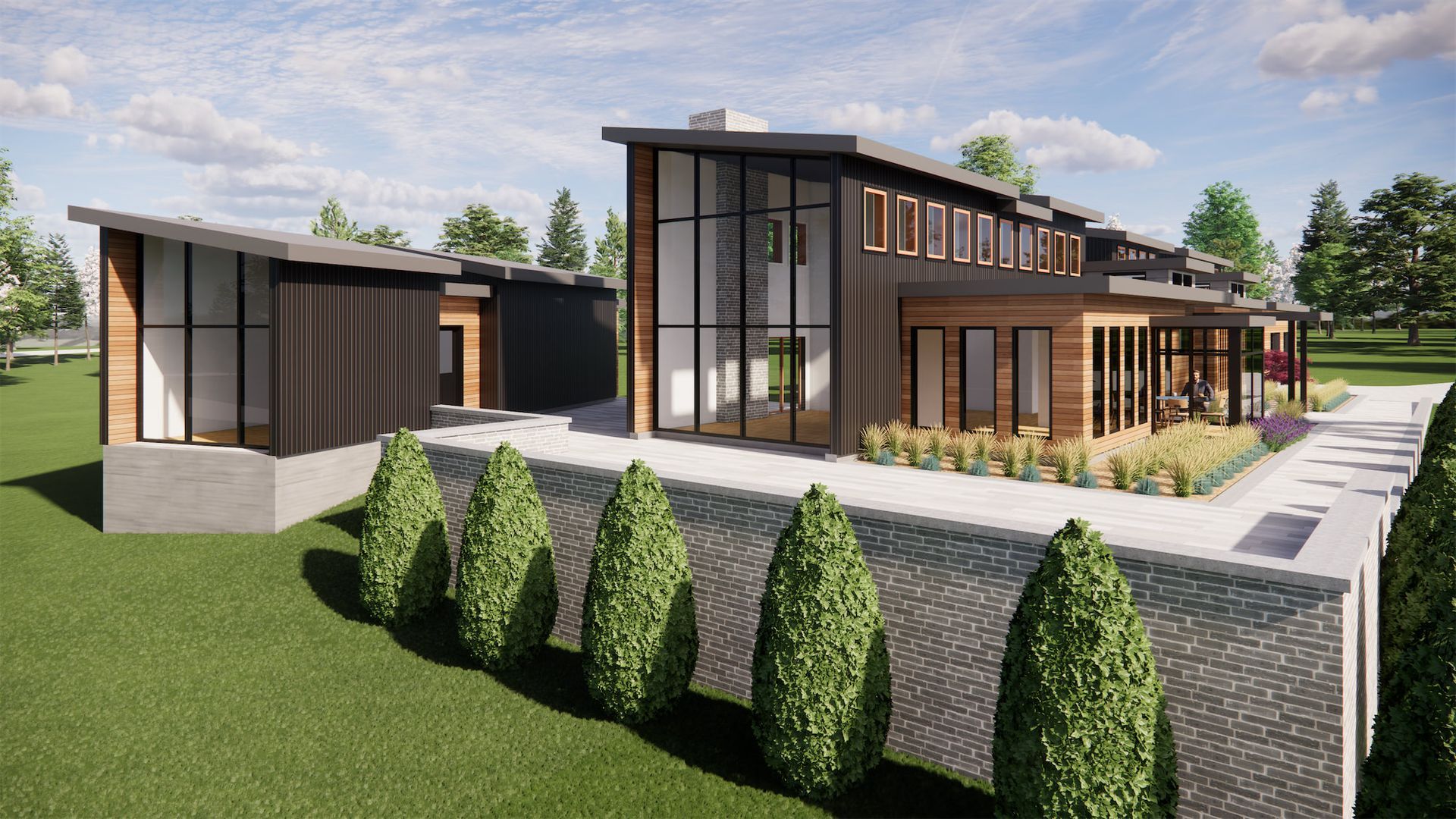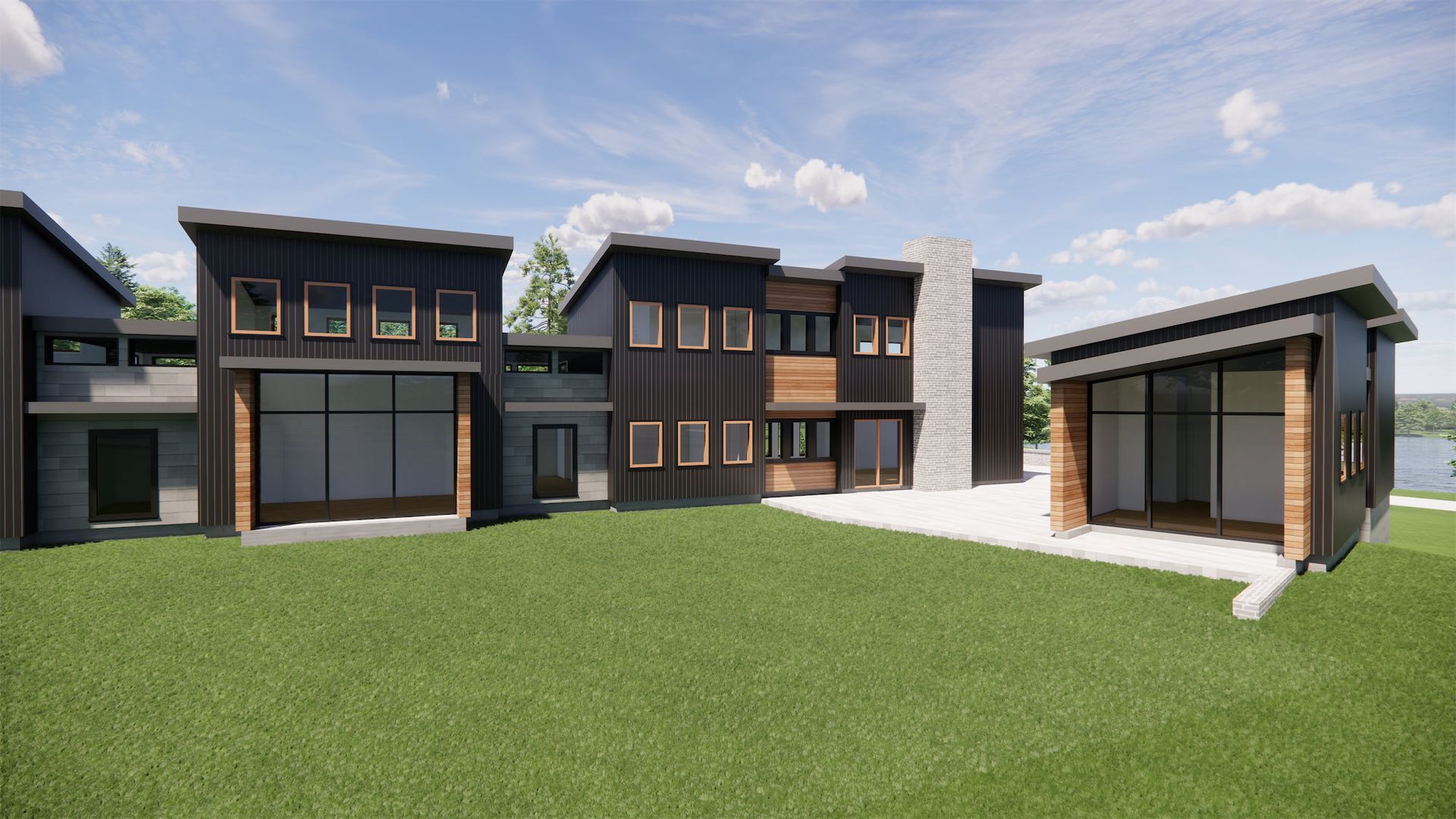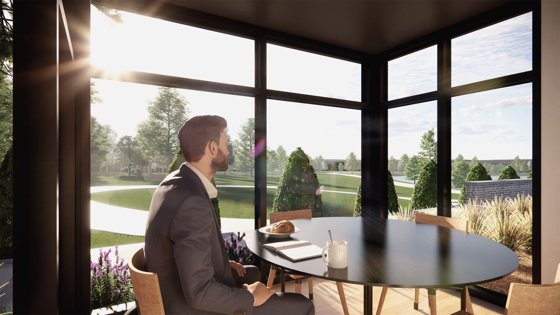 An all glass breakfast nook that captures early morning sunlight and provides views down the pond provides the homeowner a quiet space to have their morning coffee. A large kitchen and pantry provides room for cooking large meals. The spacious living room feels just as comfortable with a few people or serval guests. The primary suite is removed from the main living spaces to give a buffer from the noise. A seperate guest house / office pavilion allows for working at home to be removed from where the family gathers and also provides for a courtyard between the spaces to be used for outdoor dining.