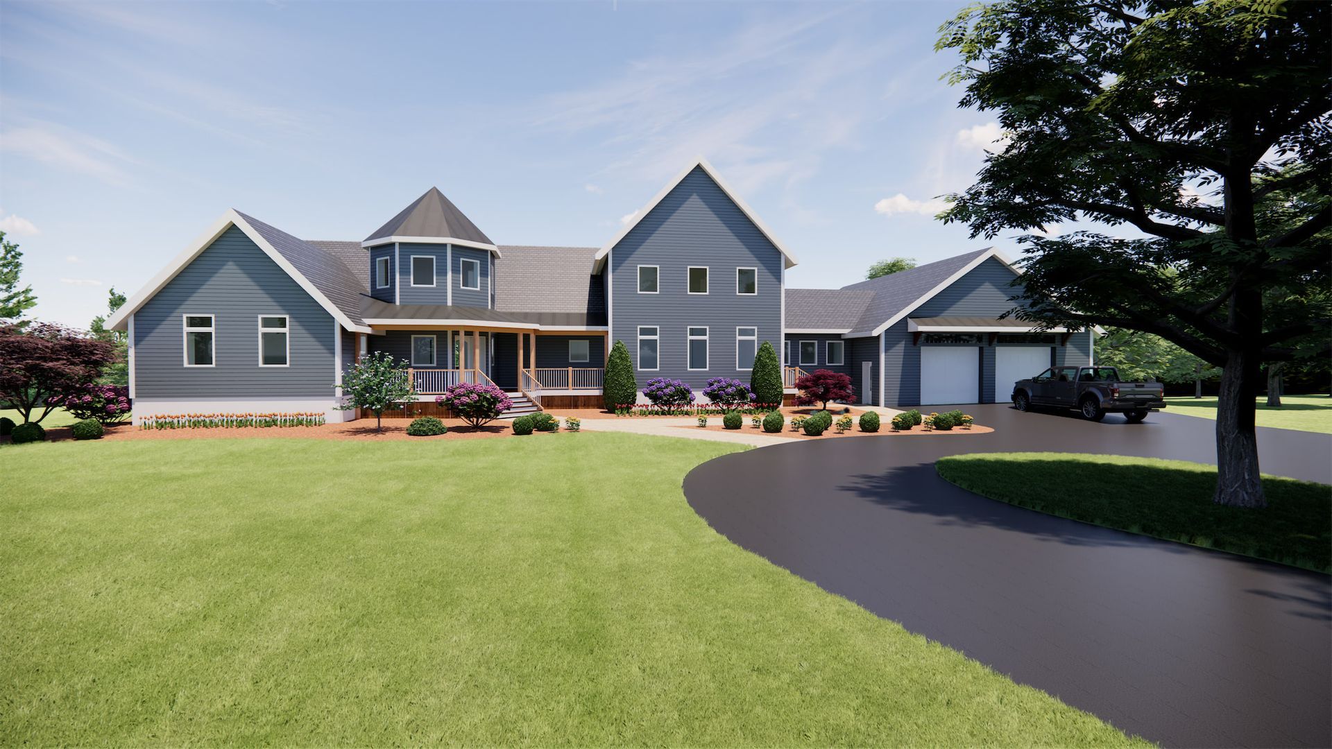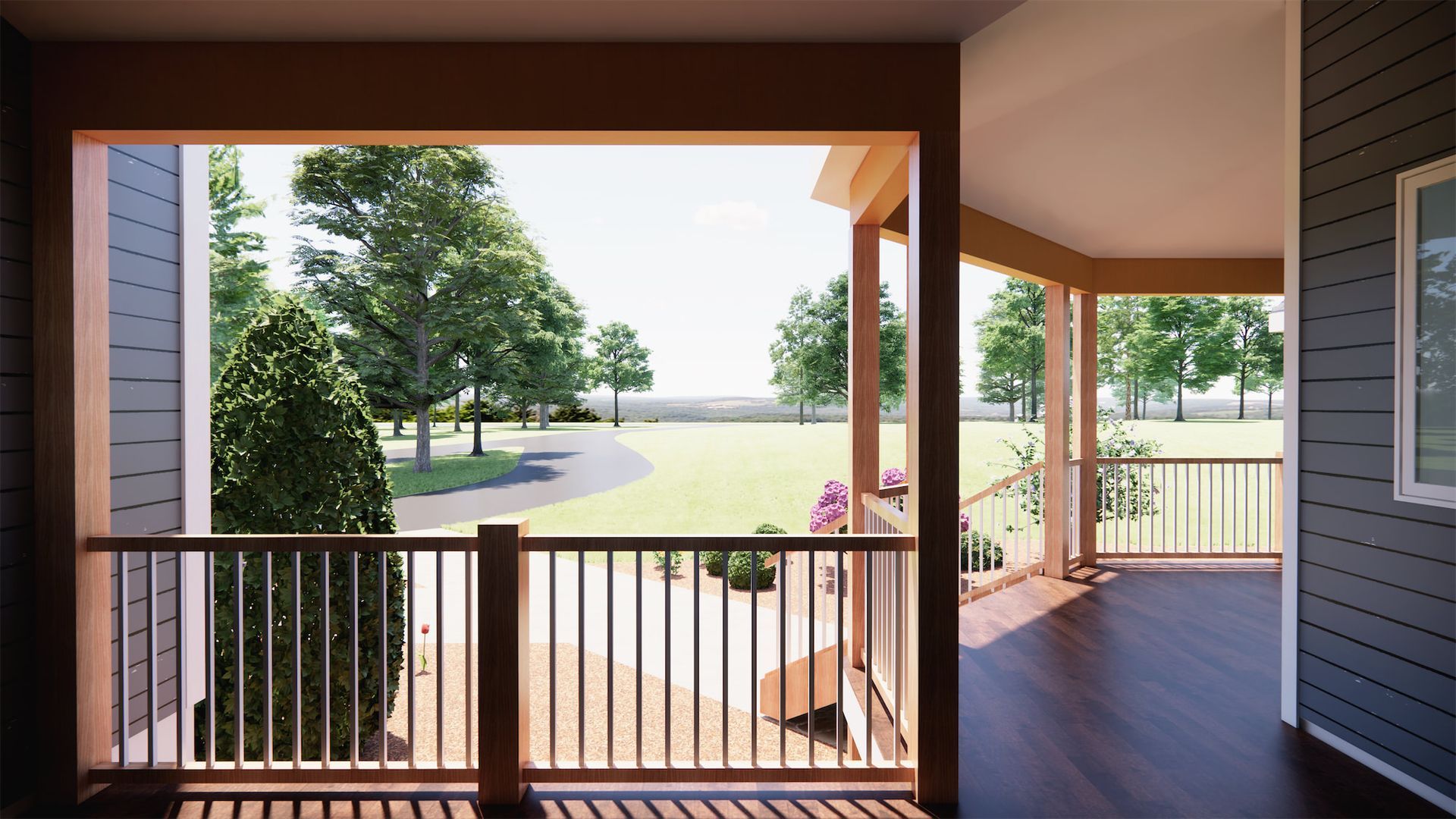 The location of the home, ontop of a hill has a view of the sunset over a nearby mountain. To gain sunset views the front porch is positioned to capture these views. The upper level of the entry turret provides a lookout for an even more expansive view, this space will also become a cozy reading nook.